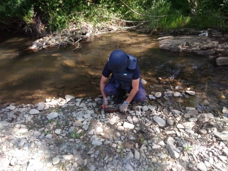 Ще одне повідомлення надійшло вчора, у цьому ж районі тільки у селі Кострино. Під час риболовлі у річці Уж місцевий мешканець натрапив на підозрілий металевий предмет. Піротехніки Аварійно-рятувального загону спеціального призначення на місці події встановили, що це мінометна міна калібром 82 мм часів Другої світової війни.