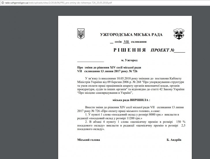 Згідно з текстом проекту, планувалося збільшити зарплатню міському голові: «Внести зміни до рішення ХІV сесії міської ради VII скликання 13 липня 2017 року № 726 «Про оплату праці міського голови», а саме: 1. У пункті 1 слова «посадовий оклад у розмірі 8000 грн.» викласти в редакції «посадовий оклад у розмірі 11200 грн.» 2. В абзаці 4 пункту 1 слова «щомісячну премію в розмірі 150 % посадового окладу» викласти в редакції «щомісячну премію в розмірі 2,5 посадового окладу», – зазначається у проекті рішення.