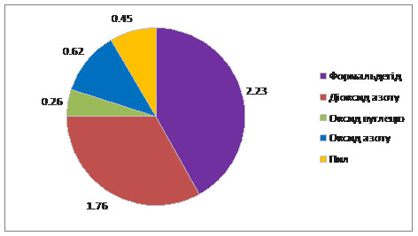 Порівняння середньої за місяць концентрації забруднюючих речовин із гранично допустимою середньодобовою концентрацією показало підвищений рівень забруднення формальдегідом (1,85 ГДК с. д.) та діоксидом азоту (1,76 ГДК с. д.).