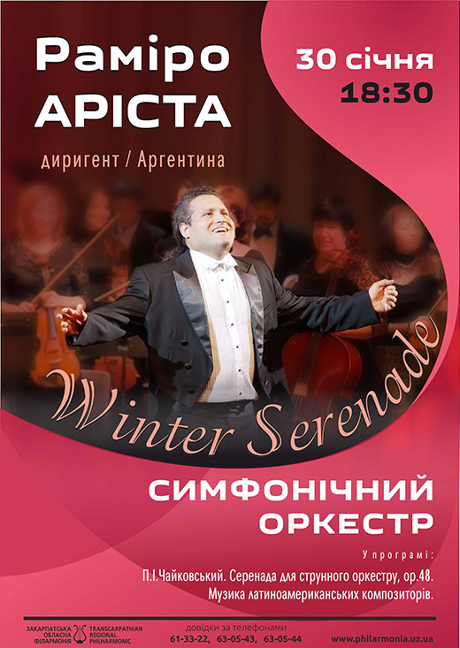 Цього разу симфонічний оркестр філармонії презентує програму під назвою «Winter Serenade». У концерті прозвучать фрагменти із балету «Лускунчик» і Серенади для струнного оркестру оп.48 Петра Чайковського та латиноамериканська музика, написана композиторами Мексики, Перу, Аргентини, Еквадору, Уругваю, Колумбії, Бразилії, Куби. Ведуча – музикознавець Наталія Піцур. Початок о 18.30.