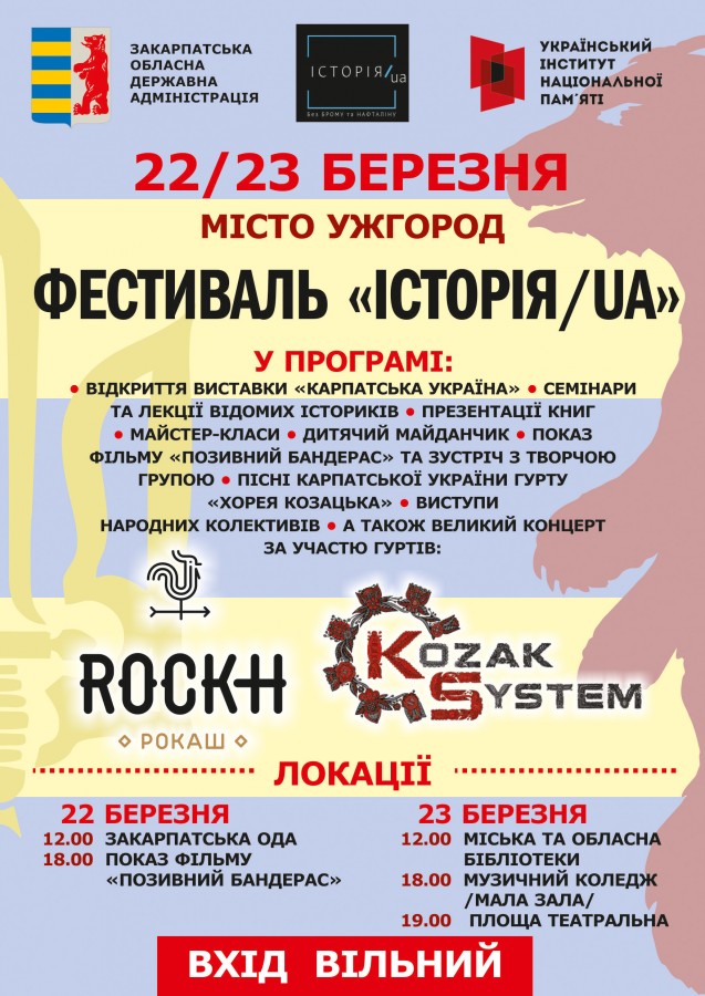 Черговий фестиваль «Історія:UA» відбудеться 22-23 березня на Закарпатті. Приурочений він до 80-річчя утворення «Карпатської України». «Ця подія надзвичайно важлива як для мешканців цього краю, так і для всієї України. Вона продемонструвала прагнення українців Закарпаття бути частиною єдиного українського народу. За здійснення цього прагнення вони готові були заплатити найвищу ціну, тому піднялися на збройну боротьбу за свободу. Коротка але яскрава історія Карпатської України стала однією з тих сторінок нашої історії, якою пишається кожен українець», – зазначає Голова Українського інституту національної пам’яті Володимир В’ятрович.