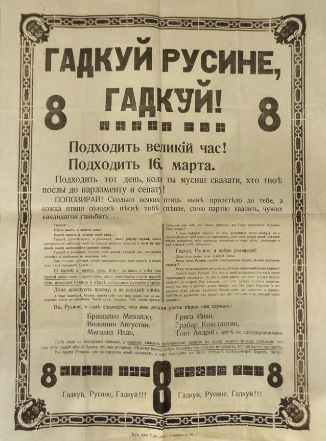 Спільнота Transcarpathian Heritage розмістила у мережі Фейсбук агітаційно-просвітницький плакат часів Чехословаччини до виборів 1924 року. Це були перші вибори делегатів то парламенту та сенату Чехословацької республіки на Підкарпатській Русі.