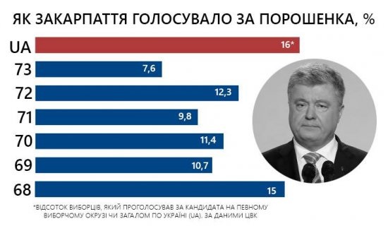 Петро Порошенко найбільшу підтримку виборців отримав в Ужгороді та районі, Юлія Тимошенко – у 70 окрузі (Великий Березний, Міжгір’я, Воловець). Неочікувані результати на Закарпатті має і кандидат від Опоблоку – Юрій Бойко, найактивніше його підтримували у Хусті та прилеглих районах.