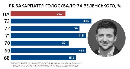 Отже, загалом у Закарпатській області у голосуванні взяли участь 443 329 виборці. Явка, традиційно, невисока. За результатами опрацювання 100% протоколів, лідером на Закарпаття, як і у більшості областей України, є Володимир Зеленський. За нього проголосували 38,35% виборців. Найбільше підтримки виборців лідер виборчих перегонів має на Берегівщині та Виноградівщині, там, де у Петра Порошенка – найнижчий по області результат.
