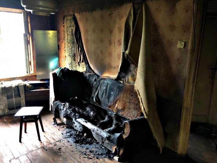 Вогнем знищено диван та постільні речі, а також закопчені стіни кімнати.