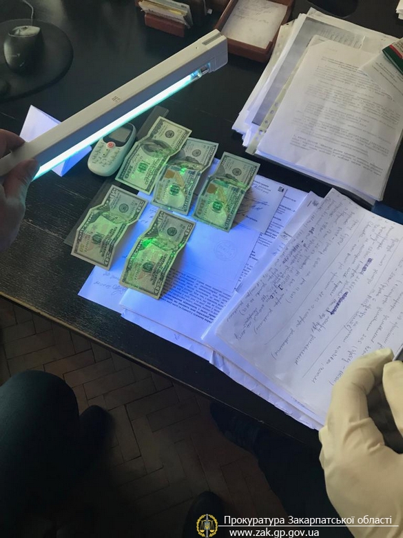 Процесуальними прокурорами прокуратури Закарпатської області спільно із співробітниками Управління захисту економіки в Закарпатській області ДЗЕ НП України викрито начальника одного з управлінь Закарпатської ОДА під час отримання 400 дол США неправомірної вигоди.