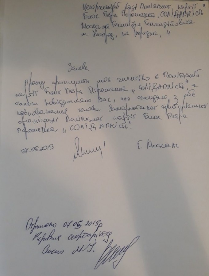 «Прошу припинити моє членство в політичній партії Блок Петра Порошенка «Солідарність», – йдеться в заяві. – Також повідомляю, що складаю з себе повноваження голови Закарпатської територіальної організації політичної партії Блок Петра Порошенка «Солідарність».