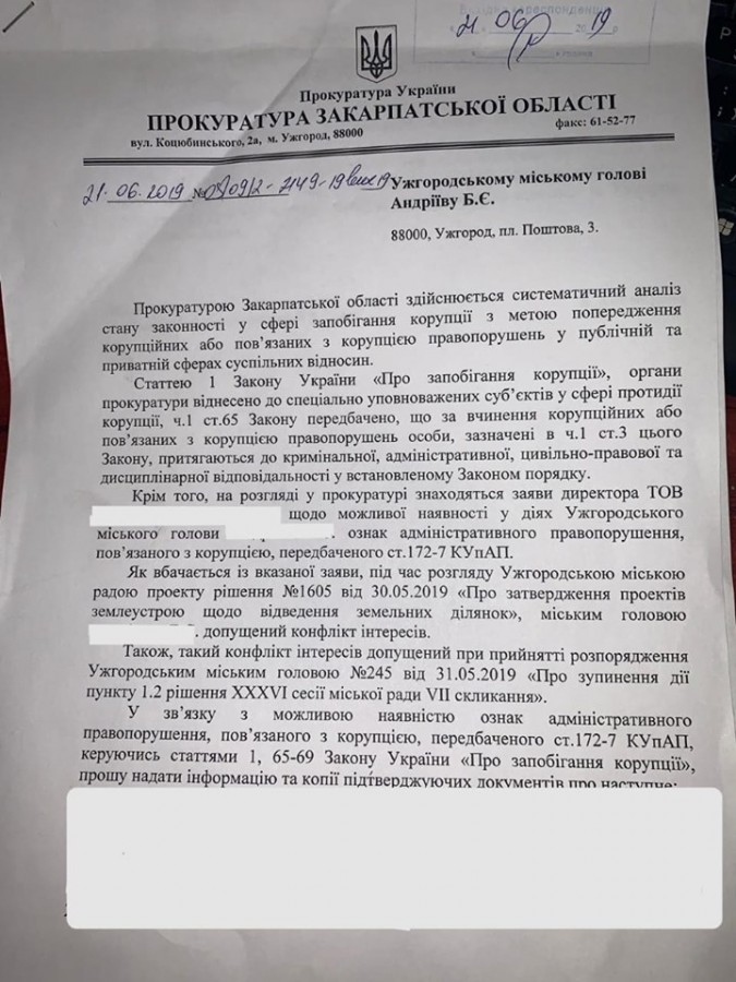 При цьому задіює служби Ужгородської міськради. Направляється у погрозливій формі лист фірмі, яка розробляла проект землеустрою з вимогою зупинити роботи, що можна однозначно кваліфікувати, як конфлікт інтересів і здійснення корупційного діяння.