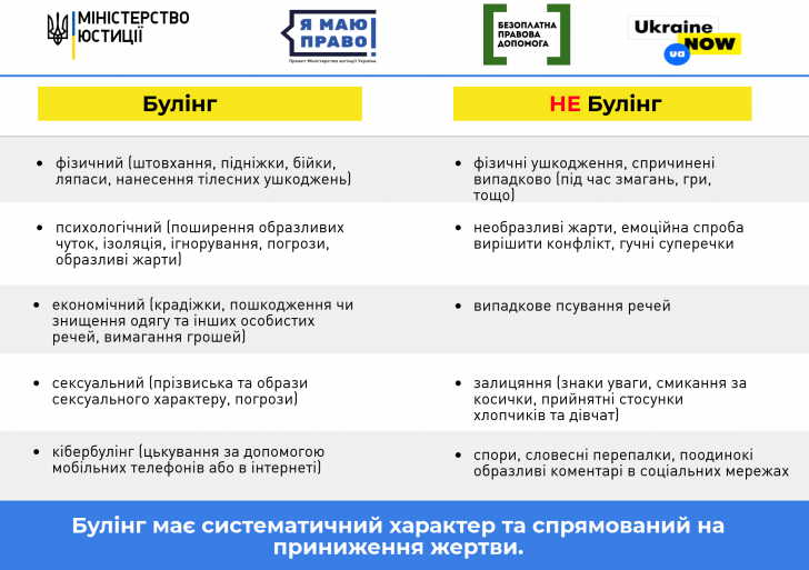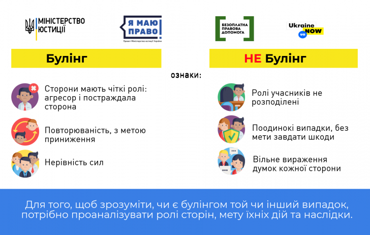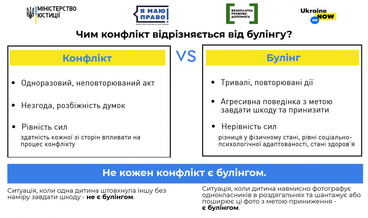 Щоб було легше відмежувати булінг від інших ситуацій, ось декілька інформаційних карток, в яких визначено основні відмінності булінгу від конфлікту та інших випадків, які можуть виникати між учасниками освітнього процесу. Давайте разом розберемось, що таке булінг та як його вирізнити з-поміж інших ситуацій.