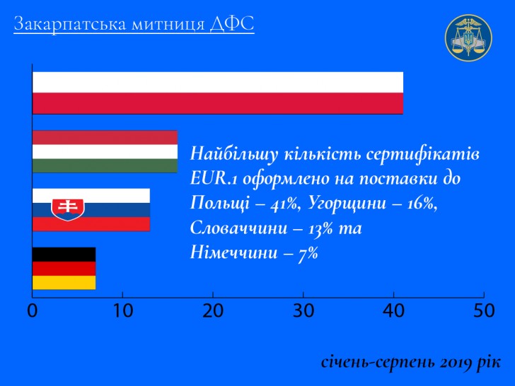 Протягом восьми місяців 2019 року Закарпатська митниця ДФС видала суб’єктам зовнішньоекономічної діяльності 5 298 сертифікатів форми EUR.1.