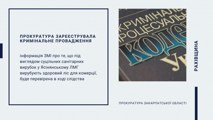 Рахівським відділом Тячівської місцевої прокуратури зареєстровано кримінальне провадження за повідомленням ЗМІ про те, що під виглядом суцільних санітарних вирубок у Ясінянському ЛМГ вирубують здоровий ліс для комерції.