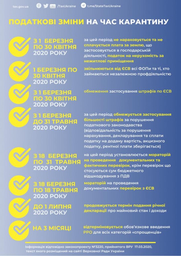 17 березня 2020р. Верховна Рада України прийняла за основу та в цілому законопроект 3220 «Про внесення змін до Податкового кодексу України та інших законів України щодо підтримки платників податків на період здійснення заходів, спрямованих на запобігання виникнення і поширення коронавірусної хвороби (COVID – 19)».