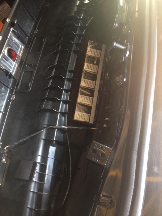 Під час проведення контрольних операцій у прикордонного наряду виникли сумніви щодо законності намірів іноземця, що прямував на виїзд з України. Його автомобіль скерували на поглиблену перевірку. Під час проведення огляду прикордонники спільно з митниками виявили близько 1500 пачок сигарет з акцизними марками України.  Їх приховали у спеціально виготовленому тайнику у задньому бампері та у сидіннях автівки. Аби дістатися до сховків, правоохоронцям довелося демонтувати декоративну обшивку та додаткові каркаси, якими замаскували тютюн.