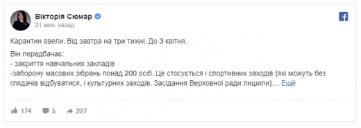 Деталі: Згідно із повідомленням нардепки карантин передбачає закриття навчальних закладів, -заборону масових зібрань понад 200 осіб. Це стосується і спортивних заходів (які можуть без глядачів відбуватися, і культурних заходів. Засідання Верховноі ради лишили), закриття авіасполучення з деякими країнами.
