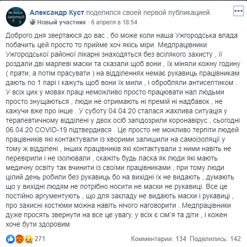 Доброго дня звертаюся до вас , бо може коли наша Ужгородська влада побачить цей просто то прийме хоч якісь міри. Медпрацівники Ужгородської районної лікарні знаходяться без всілякого захисту , її роздали дві марлеві маски та сказали щоб вони , їх міняли кожну годину ( прати, а потім прасувати ) на відділеннях немає рукавиць працівникам дають по 1 парі і кажуть щоб вони їх мили, і обробляли антисептиком.