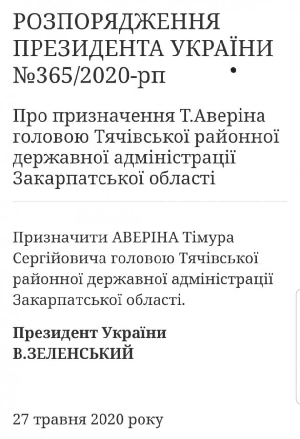 Призначити АВЕРІНА Тімура Сергійовича головою Тячівської районної державної адміністрації Закарпатської області.