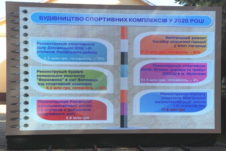 Під час зазначеного заходу розглянуто питання освоєння коштів та завершення робіт за програмою Президента України „Велике будівництво”. Зокрема, буде уведено в експлуатацію 18 одиниць, серед яких 5 закладів дошкільної, 5 закладів загальної середньої освіти і 8 спортивних об’єктів. Загалом роботи з освоєння коштів мають бути завершені до кінця 2020 року, а зазначені заклади освіти заплановано відкрити до початку нового навчального року.