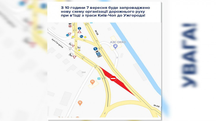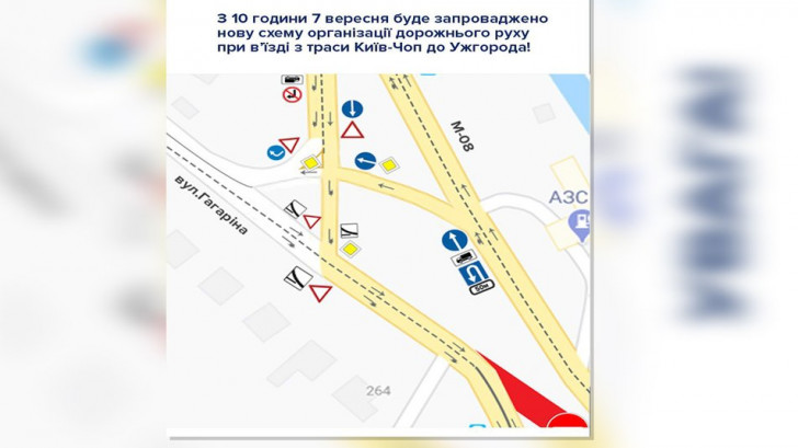 Нову схему організації дорожнього руху при в’їзді з траси “Київ-Чоп” до Ужгорода (вулицею Гагаріна) запроваджено з 10-ї години 7 вересня 2020 р.