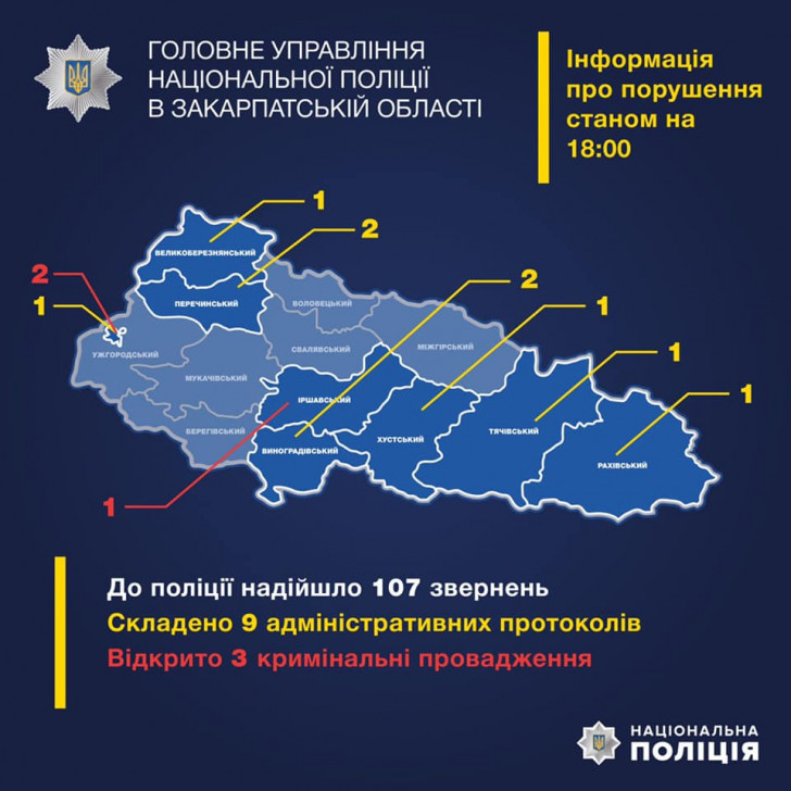 Окрім цього поліцейські зафіксували два порушення карантинних обмежень в обласному центрі Закарпаття та в смт. Великий Березний. Складено протоколи за статтею 44-3 КУпАП.