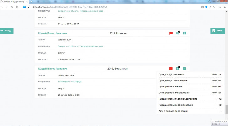 Офіційні декларації про доходи Щадея В.І. доступні для загального ознайомлення.