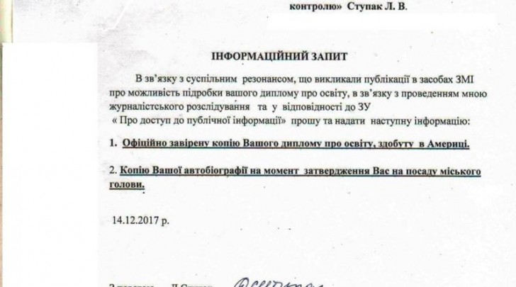 Публікації матеріалів про те, що Мукачівський міський голова не має ступеню американського унівеситету, як зазначено у біографічних даних, спонукали редактора газети “СНК” Ларису Ступак подати інформаційний запит з цього приводу. Журналіст просить надати офіційно завірену копію диплому про освіту, здобуту в Сполучених Штатах Америки та копію автобіографії на момент затвердження на посаду…
