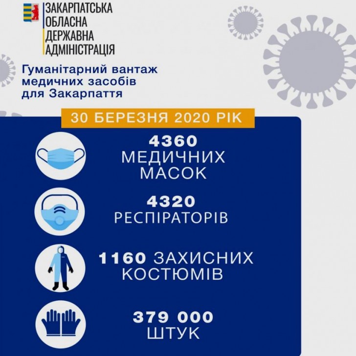 Олексій Гетманенко:”Дякую Президенту та уряду за черговий вантаж, який отримало Закарпаття! – більше 8 тисяч медичних масок і респіраторів – 1160 костюмів біозахисту – 379000 штук медичних рукавичок Необхідні засоби захисту отримають медики області та служби, дотичні до заходів по запобіганню та поширенню коронавірусу на Закарпатті. Ця партія- другий вантаж,…